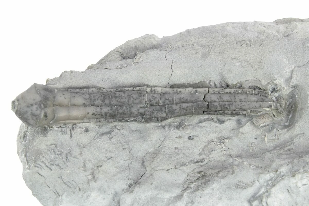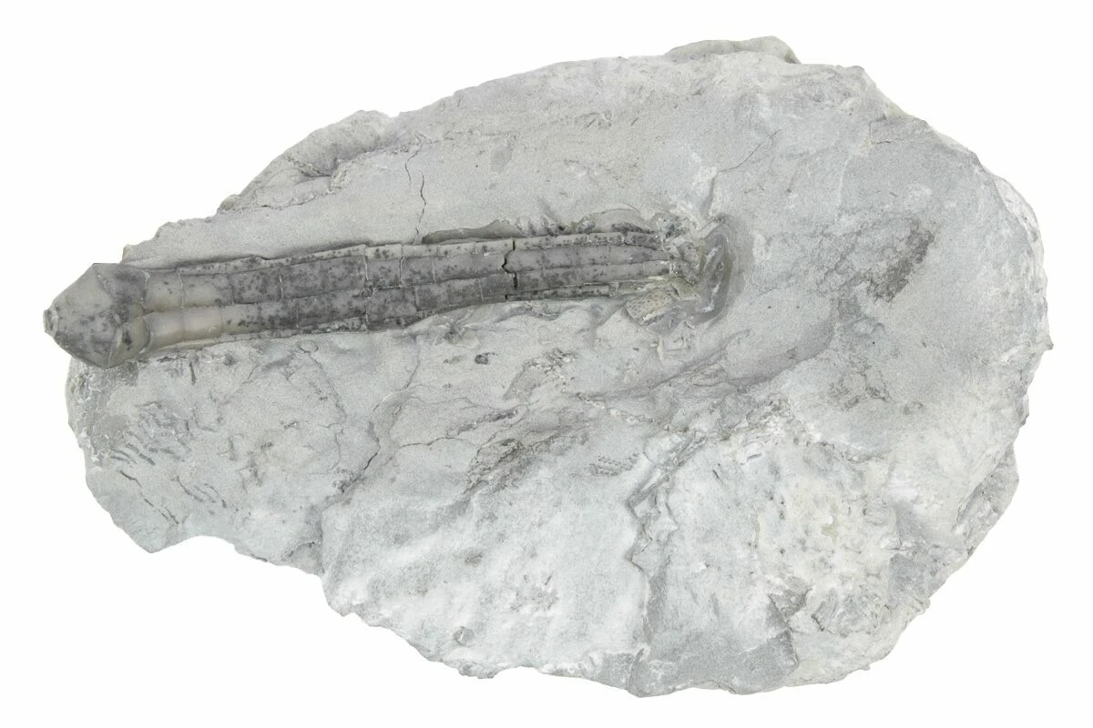 This is a Synbathocrinus swallovi crinoid from the Edwardsville Formation of Monroe County, Indiana. The quality of preparation on this fossil is exquisite, using skillful air-abrasion techniques under a stereo microscope.