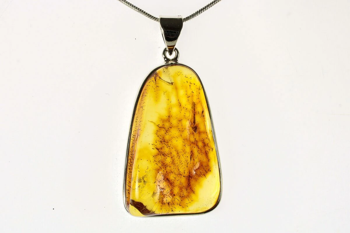 This is a 1.6″ tall pendant made from 44 million year old baltic amber. The amber is set in 925 sterling silver and comes with a 24″ silver plated snake chain to complete the necklace.