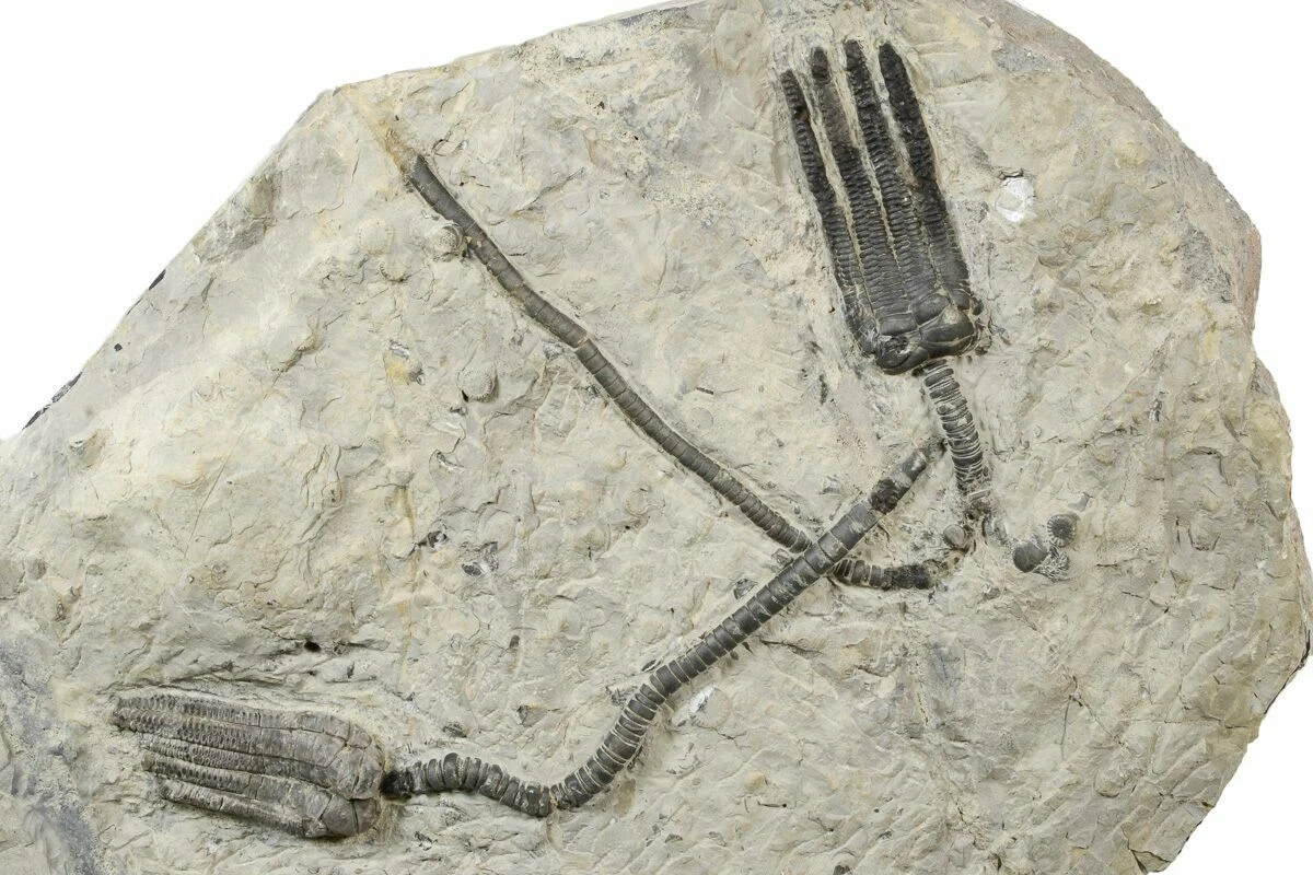 This is a 14″ wide section of shale containing two Encrinus liliiformis crinoids from Alverdissen, Germany. They come from the Muschelkalk Formation which is Traissic in age. The larger specimen is 9″ including its long stem. There is some restoration to one of the arms on the larger specimen.