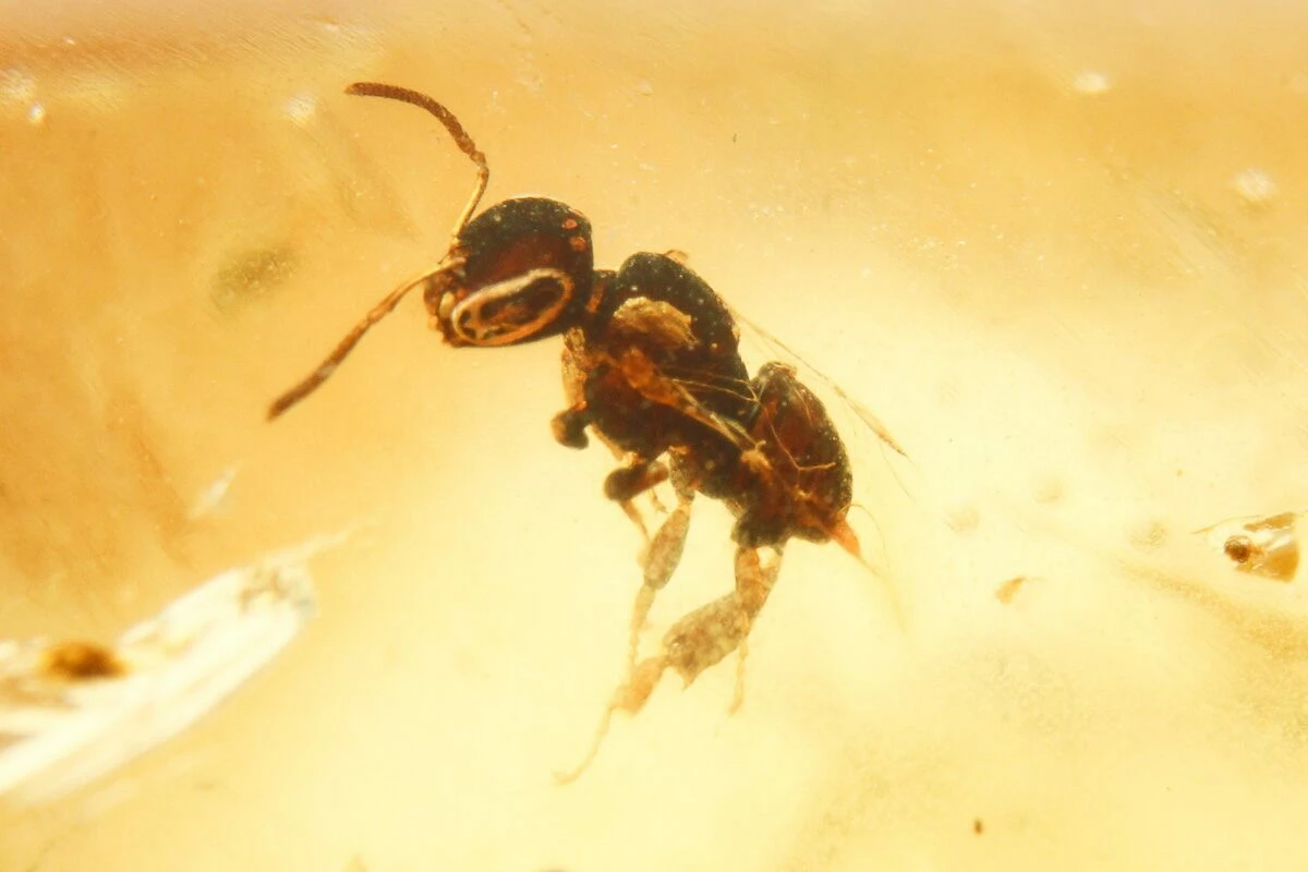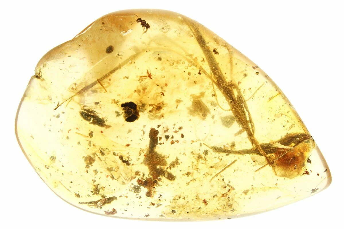 This is a polished piece of copal from Colombia. It’s packed with fossils including wasps, flies, plant debris, and a termite with an unusual unicorn horn. The copal bears gorgeous golden honey coloration, measures 2.05″ wide, and weighs 10.8 grams. The entire specimen has been polished to a glossy-finish.