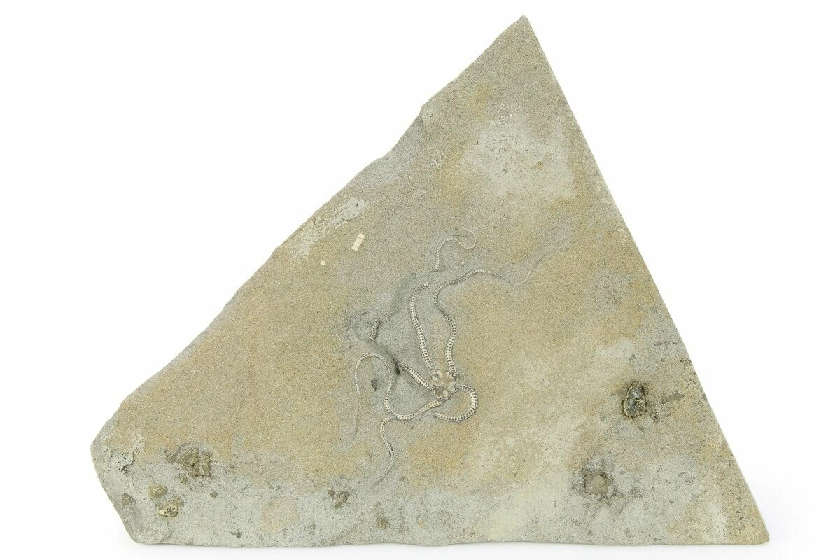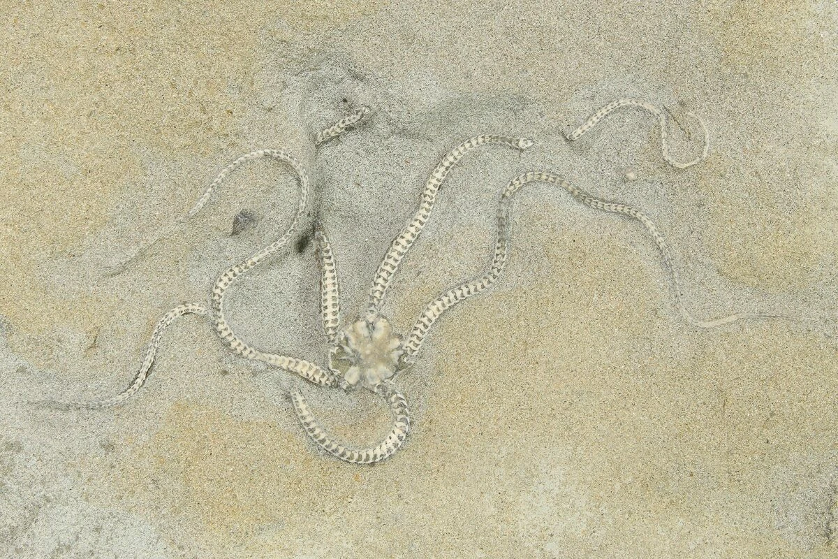 This is an absolutely gorgeous, well preserved fossil brittle star (Palaeocoma egertoni), collected from the Bridport Sands (Middle Lias) of Dorset, England. It is Lower Jurassic in age, or approximately 200 million years old. It has been prepared using air abrasives to expose the wonderful details, and is centered on a slab of limestone. It’s 2.8″ wide across its longest measurement.