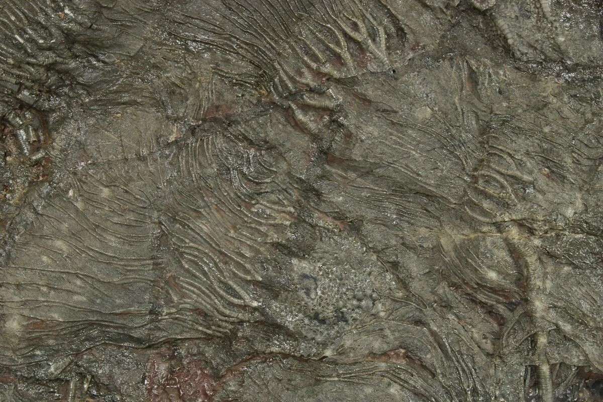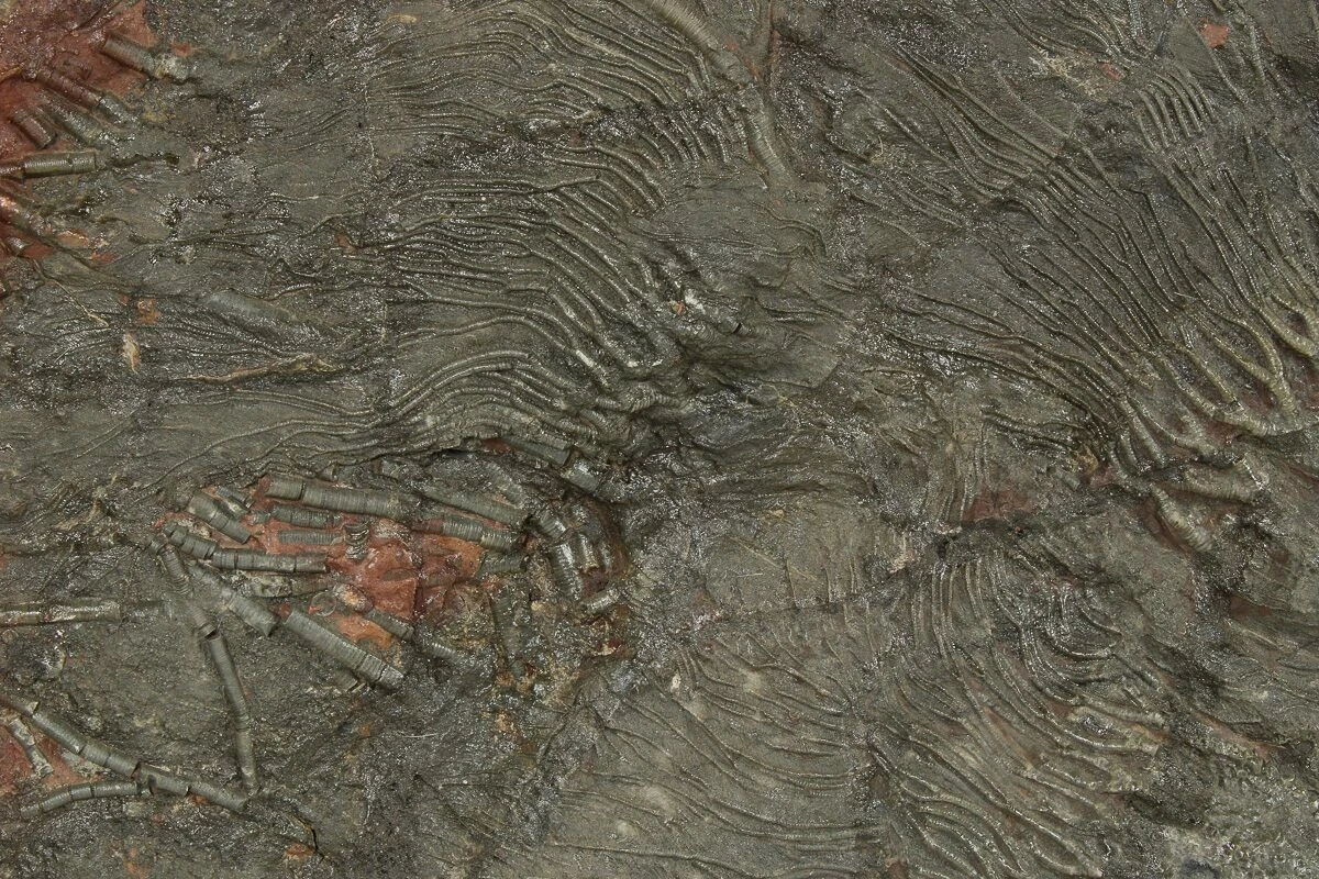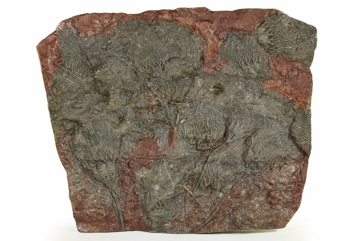 This is plate of Silurian aged, Scyphocrinites elegans crinoids from Boutschrafin, Erfoud, Morocco. The entire rock measures 25 x 17.7″. As with basically all the crinoids from this locality the rock has been repaired with some gap fills as these crinoid tend to come out of the ground in many pieces and the plates have to be put back together.