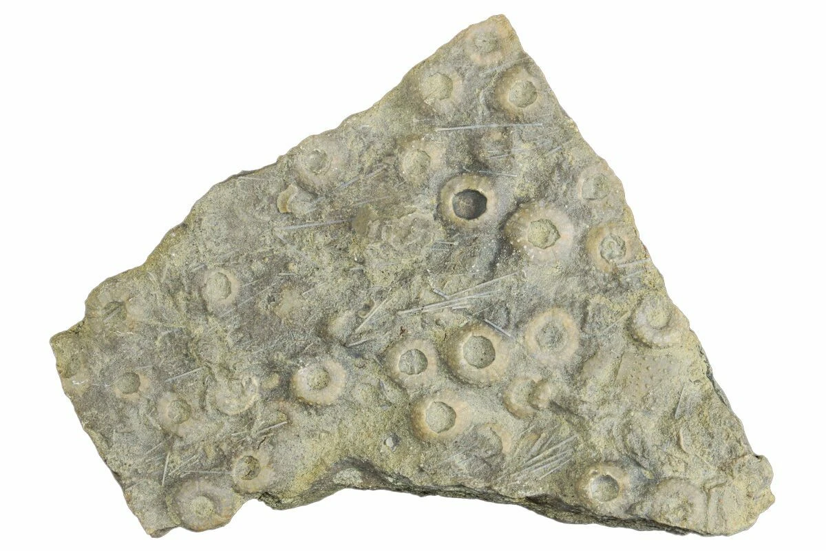 This is a cluster of small Early Cretaceous (Barremian Stage) fossil urchins (Trochotiara bourgueti), collected from Agadir, Morocco. The spines of these urchins have also been exposed and can be found scattered across the rock.