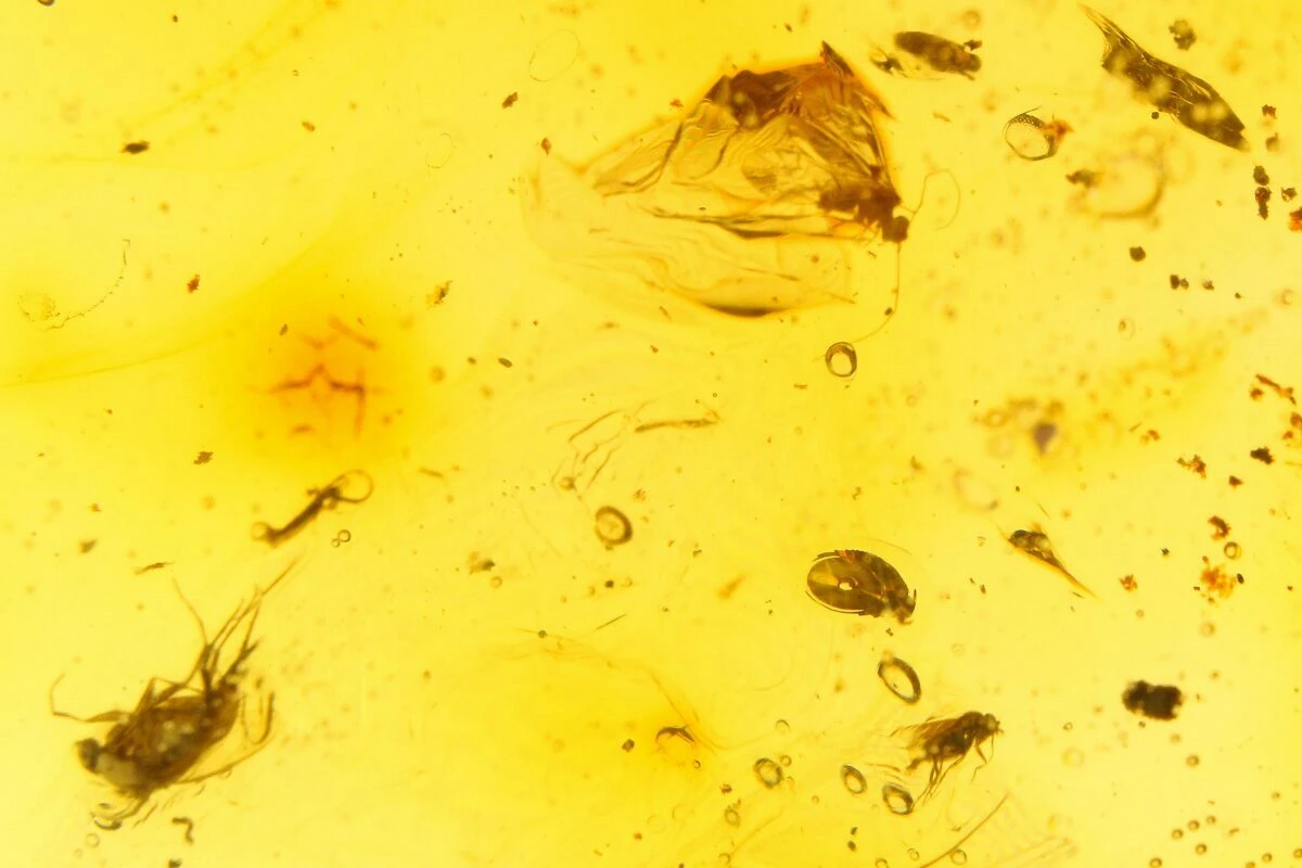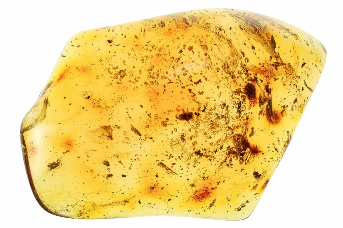 Amber is fossilized tree resin that frequently contains inclusions such as plant matter, fungi, and insects. Copal is a younger resin that has not fully fossilized, but may still be tens of thousands to several million years old. This copal is often marketed as “young amber”, which many consider a misnomer, but the exact line between copal and amber is a little bit blurry. This is especially true with modern treatment techniques that can artificially age copal into amber.