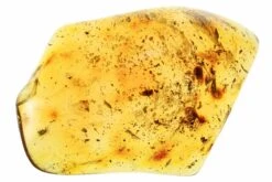 This is a polished piece of copal from Colombia. It’s packed with fossils including wasps, flies, ants, beetles, and a mite. The copal is quite large and bears gorgeous golden honey coloration, measures 3.6″ wide, and weighs 86.6 grams. The entire specimen has been polished to a glossy-finish.