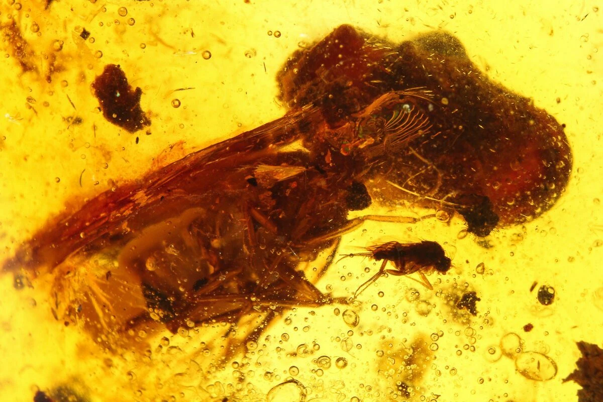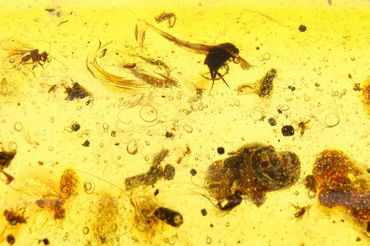 Amber is fossilized tree resin that frequently contains inclusions such as plant matter, fungi, and insects. Copal is a younger resin that has not fully fossilized, but may still be tens of thousands to several million years old. This copal is often marketed as “young amber”, which many consider a misnomer, but the exact line between copal and amber is a little bit blurry. This is especially true with modern treatment techniques that can artificially age copal into amber.