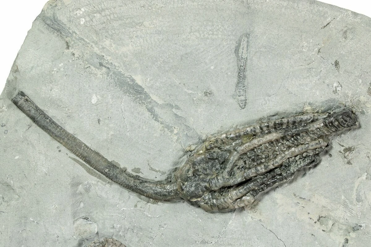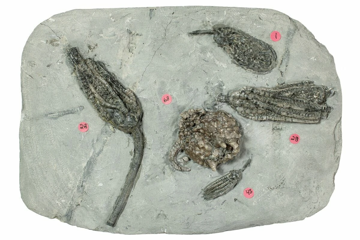 This is a beautiful, 7.9″ plate of detailed fossil crinoids from Crawfordsville, Indiana. There are eight identifiable crinoids representing four separate species. They have been microscopically prepared using air abrasives. The crinoids include Abrotocrinus coreyi, two Histocrinus coreyi crinoids, Scytalocrinus robustus, and Gilbertsocrinus tuberosus.