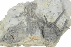 This is a beautiful, 8.9″ wide plate of detailed fossil crinoids from Monroe County, Indiana. These fossils have been microscopically prepared using air abrasives, revealing their intricate details and three dimensional preservation. The four crinoids include Histocrinus coreyi, Platycrinites hemisphericus, Dorycrinus gouldi, and Pachylocrinus aequalis