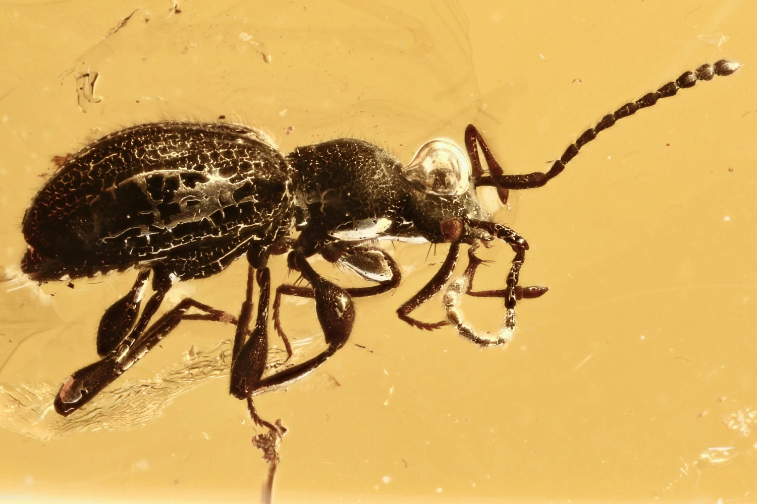 This is a beautifully detailed, 44 million year old fossil ant-like stone beetle (order Coleoptera – subfamily Scydmaeninae – genus Euroleptochromus) preserved in Baltic amber. This beetle is about 2.9mm wide.