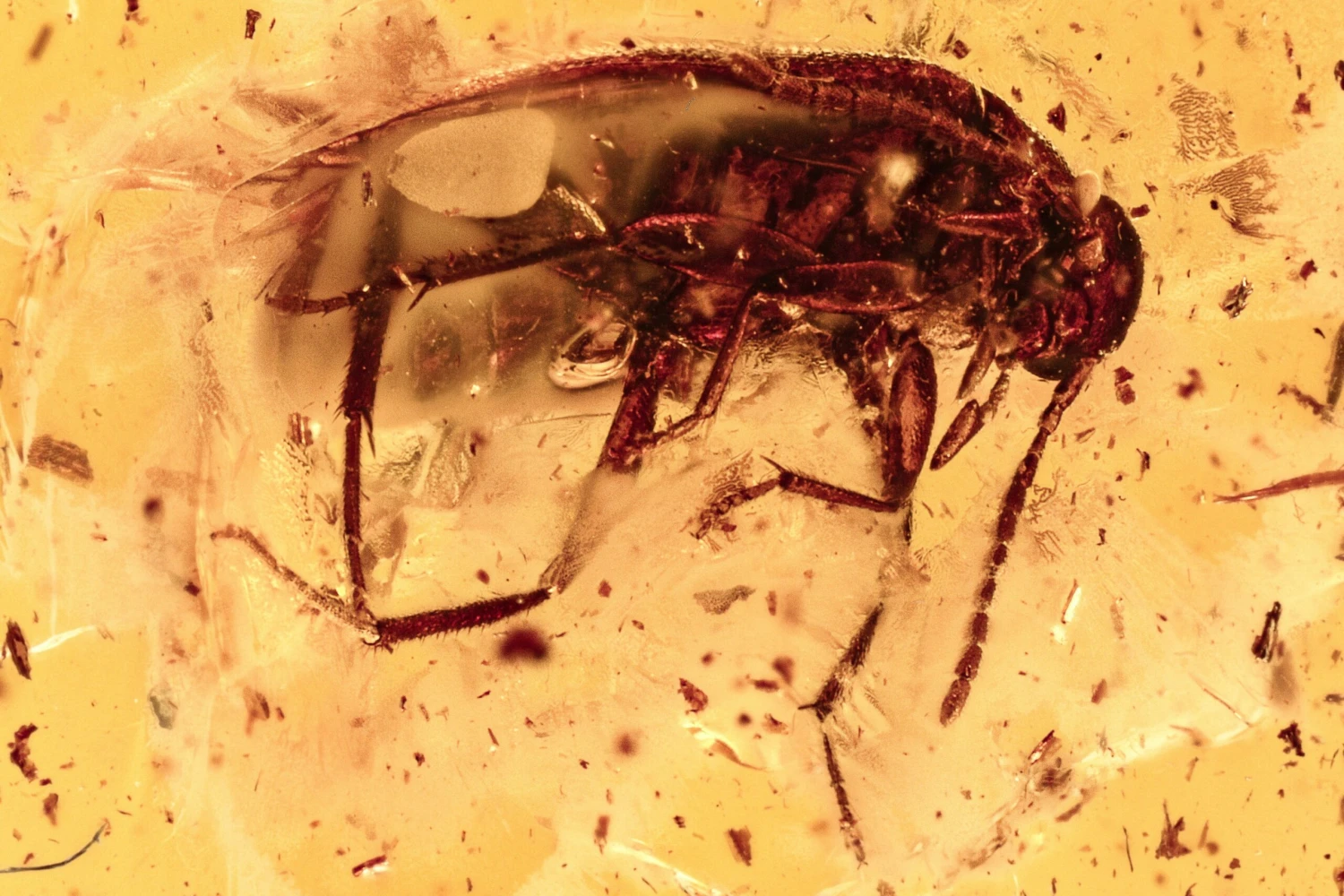 This is a 44 million year old fossil false flower beetle (order Coleoptera – family Scraptiidae) preserved in Baltic amber. This beetle is about 2.2mm long.