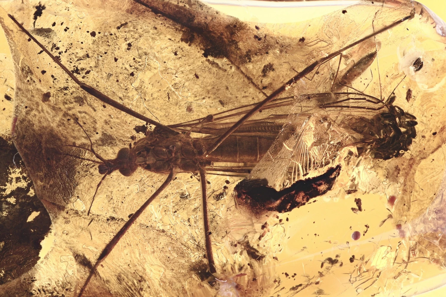 This is a beautifully detailed, 44 million year old fossil crane fly (family Tipulidae), preserved in Baltic amber. It measures 10mm long and is laying an unusually large bunch of eggs.