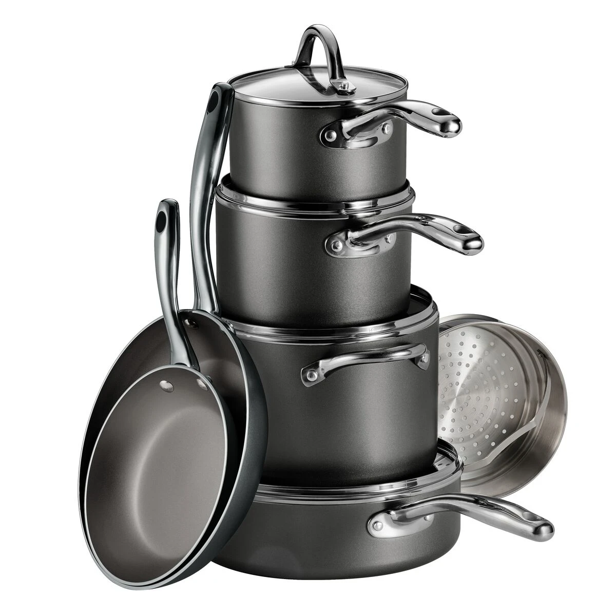 Tramontina”s 11-Piece Nonstick Cookware Set offers versatile pots and pans for cooking meals of every size. Featuring an attractive metallic colored exterior, this durable set is constructed of heavy-gauge aluminum for quick, even heat distribution when you want to brown, sear, braise and pan-fry. The titanium reinforced nonstick interiors are made without lead or cadmium and give quick release to food so you can cook with less oil. Plus, it makes cleanup a snap as the cookware can be tossed in the dishwasher. Tempered glass lids allow you to monitor your cooking progress, and ergonomically designed cast stainless-steel handles are riveted for extra support when handling cookware. This nonstick cookware is compatible with gas, electric and ceramic glass cooktops and can be used in the oven up to 350° F.