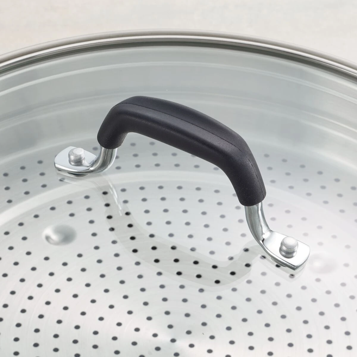 – Heat- and shatter-resistant tempered glass lid with stainless steel rim