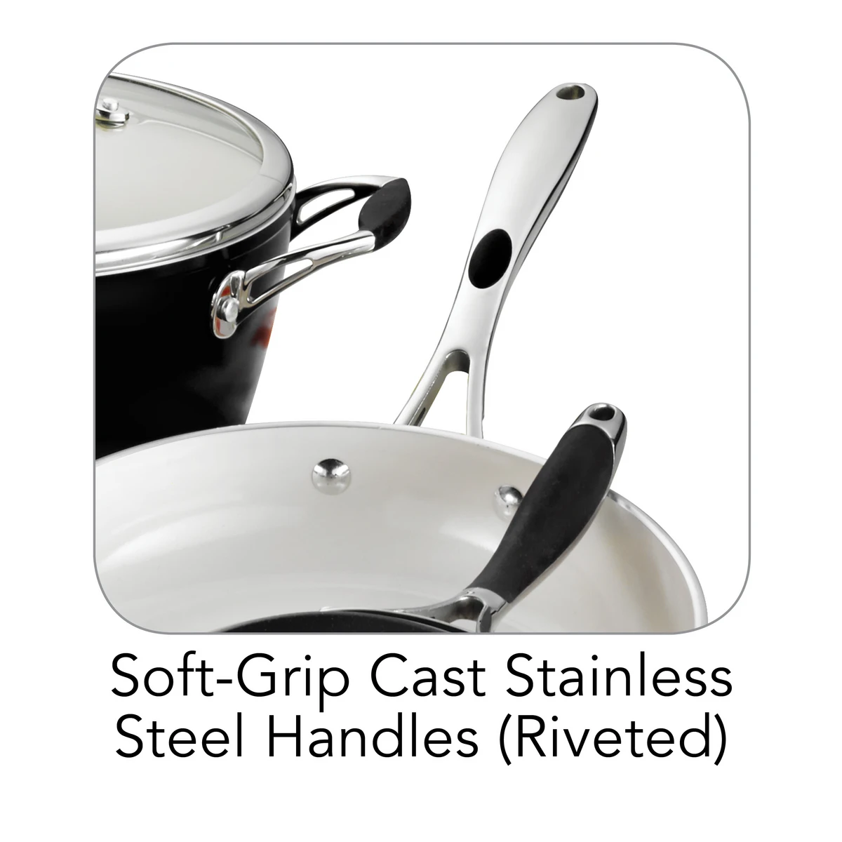 – Ergonomically designed and riveted cast stainless steel handles with soft-grip silicone accents
