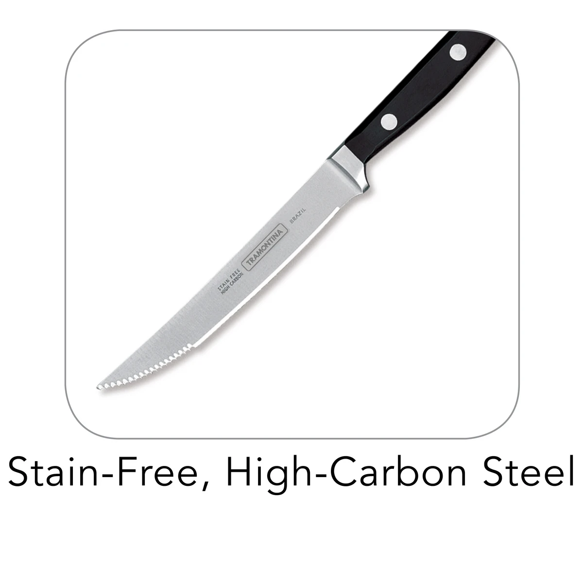 Expertly cut steaks and chops with Tramontina”s 5 Pc Deluxe Steak Knife Set with Hardwood Counter Block. The set includes four 5 in forged knives with pointed tips, a serrated edge, and a hardwood counter block. Tramontina”s knives are forged from a single solid piece of premium high-carbon stainless steel for strength and durability.