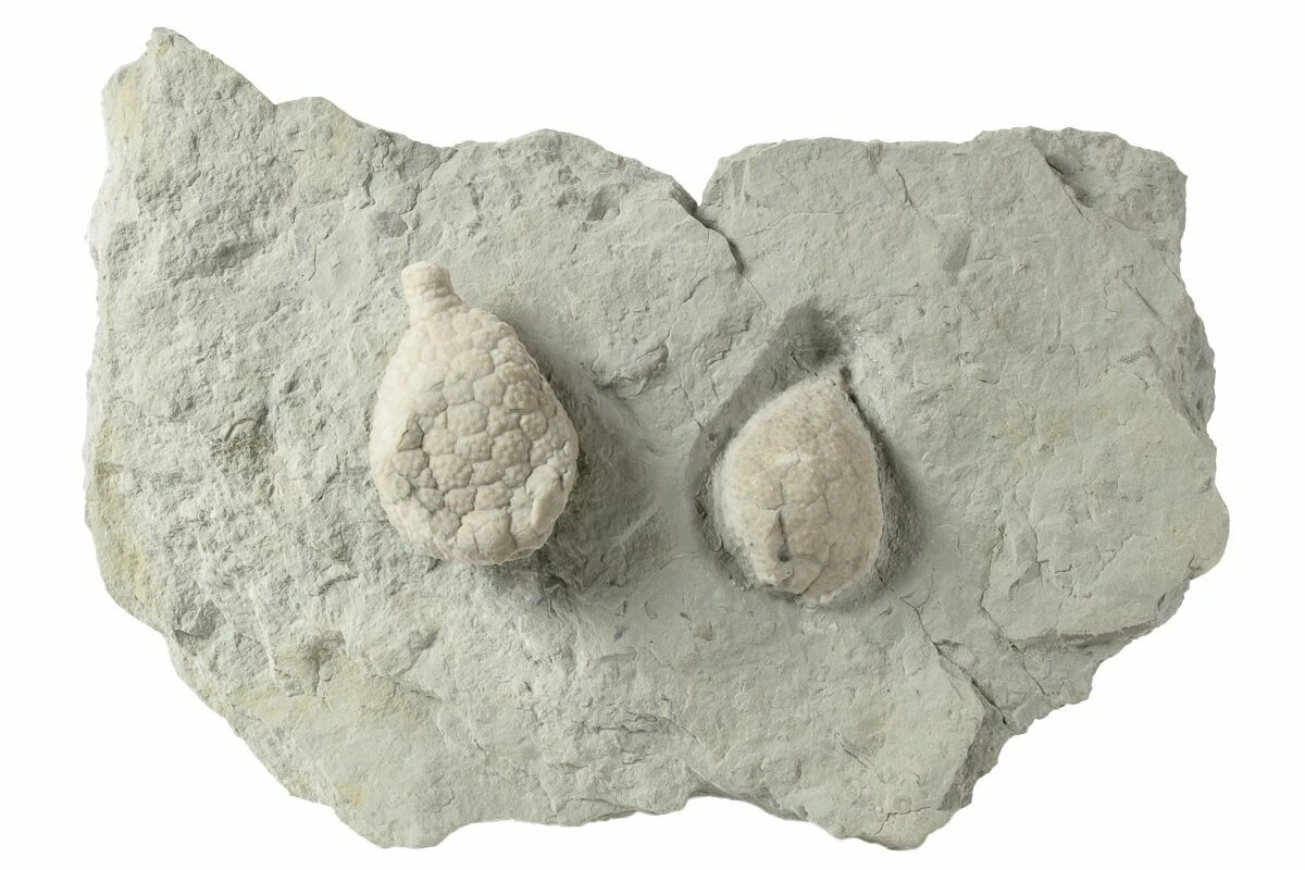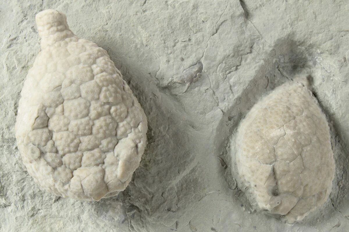 This is a 7.1″ wide shale piece that contains two cystoid (Holocystites scutellatus) fossils, collected from the Silurian period Osgood Shale of Napolean, Indiana. They have been prepped using air abrasives and the largest cystoid has been mounted to the rock.